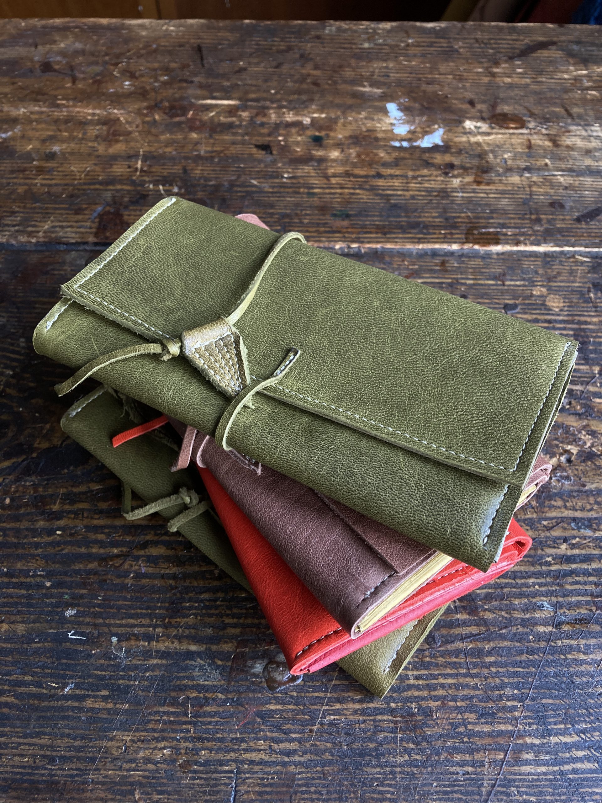 エゾジカ革(左よりグリーン、赤、こげ茶)...